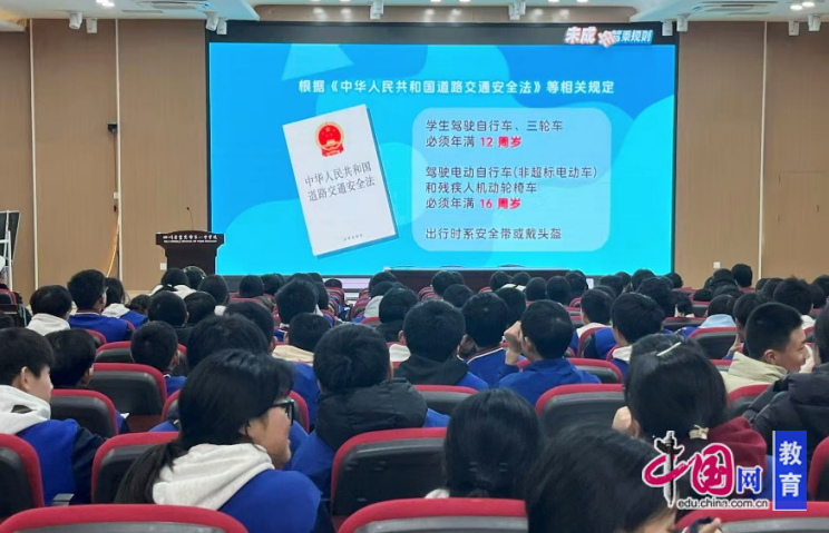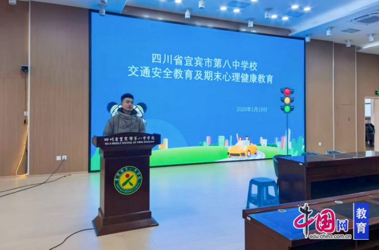 为切实增强广大师生交通安全意识,维护校园周边及学生出行安全,同时做好期末阶段学生心理疏导工作,1月19日,宜宾市第八中学校召开校园交通安全暨期末心理健康教育专题教育会。会议邀请交警四大队及菜坝镇政府交管办相关人员参与指导。会议由信息安办主任刘雄全程主持并作总结,流程包括陶传明警官主讲、观看交通安全警示片、通报菜坝镇与高新区交通警情、主持人总结并进行交通安全与期末心理健康教育。