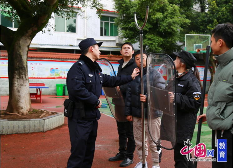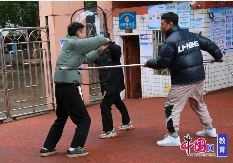 活动现场设置了实操训练,廖飞浅向学校安保人员及教职工示范了防暴盾牌、钢叉、警棍等装备的使用方法,指导参训人员掌握“防御-控制-避险”的完整流程。