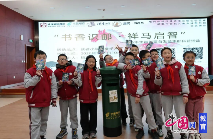 近日,由武侯区图书馆主办,中国邮政集团有限公司成都武侯分公司、成都市读者小学协办的“书香识邮・祥马启智”马年生肖邮票首发暨集邮科普活动圆满落下帷幕。该校五年级师生齐聚活动现场,在书香与邮韵的交融中,开启了一场别开生面的文化启蒙之旅。