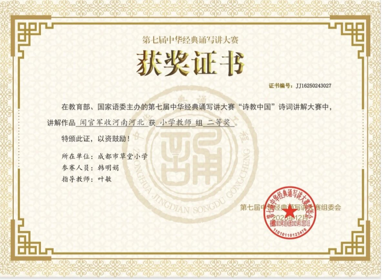 此次获奖,是韩明娟老师专业素养的彰显,更是人文青羊、诗韵草小诗词教育的丰硕成果。优异成绩的取得,更离不开青羊区教研员的全程护航与学校的全力托举。青羊教科院相关负责人表示,未来,青羊区将继续以经典诵写讲赛事为纽带,让诗词浸润课堂与生活,厚植师生家国情怀,让中华优秀传统文化在校园薪火相传。