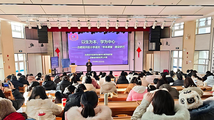 1月22日上午,合肥经济技术开发区小学语文“学本课堂”建设研讨活动在合肥一六八玫瑰园东校教育集团经开实验学校报告厅顺利举行。本次活动由合肥经开区教育发展中心教学教研室主办、安徽省郑勇名师工作室承办。来自区内各小学的教师代表共计两百余人齐聚一堂,围绕“学本课堂”的理念内涵、实施路径与任务群设计等核心议题展开深入研讨。