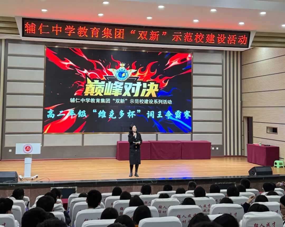 近日,重庆市辅仁中学教育集团“双新”示范校建设系列活动之高二年级“维克多杯”词王争霸赛在学校学术报告厅圆满举办。本次赛事由高二年级全体英语老师统筹组织,以丰富校园英语文化、提升学生词汇能力为核心,覆盖高二年级全体学生,历经初赛、复赛两层选拔,最终42名选手脱颖而出,站上决赛舞台展开巅峰对决。