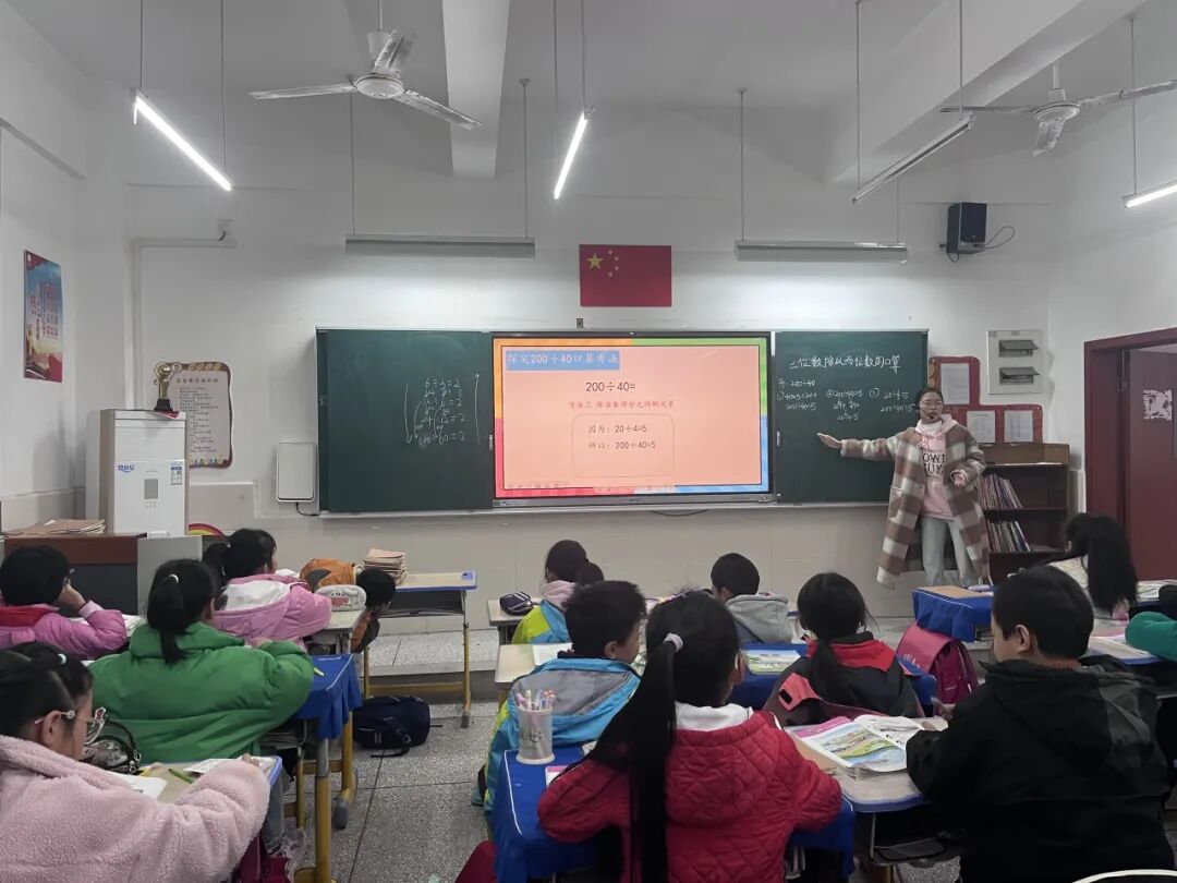 新进教师吴亚红执教的《三位数除以两位数的口算》,以复习导入、情境激趣引入课题,引导学生用多种方法探究口算方法。