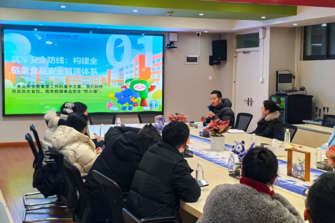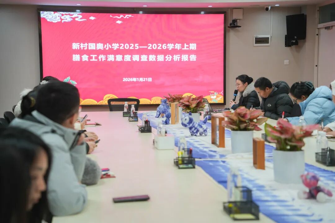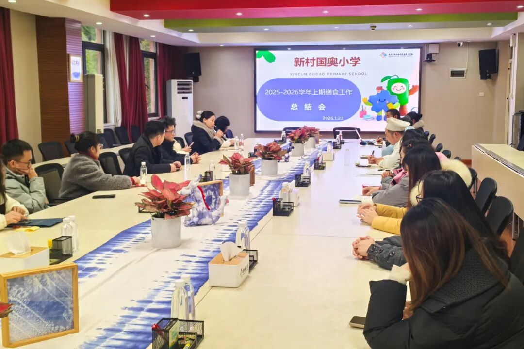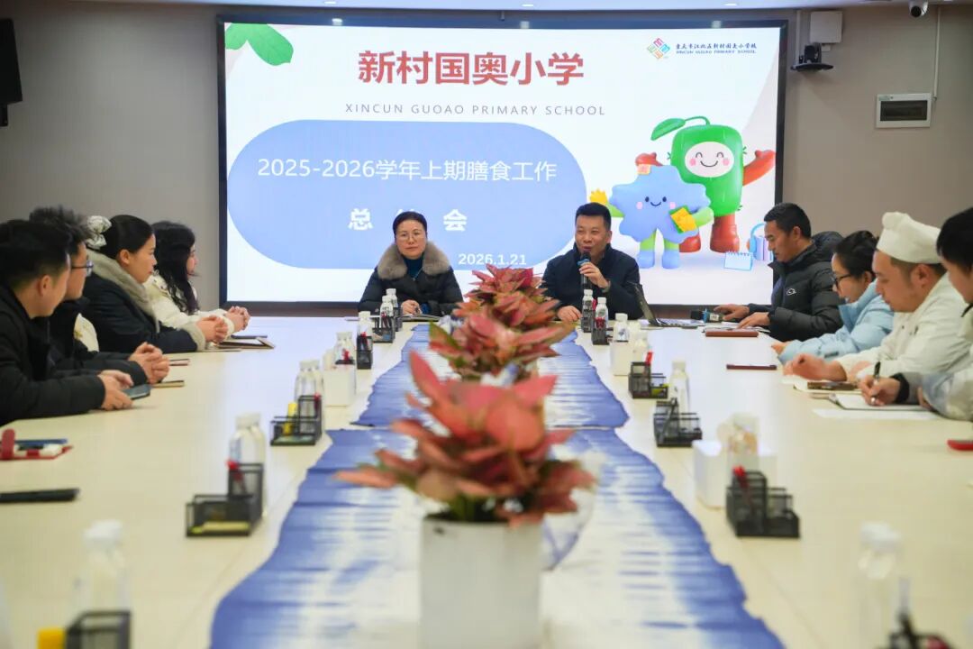为持续提升食堂服务质量,保障学生饮食安全与营养,2026年1月21日下午,重庆市新村国奥小学召开2025-2026学年上学期食堂工作总结会。会议由后勤服务中心主任、食堂团长侯兴怀主持,蒋成羽校长、杨玉秋副校长、膳食监督家长代表及食堂后厨相关工作人员参会。