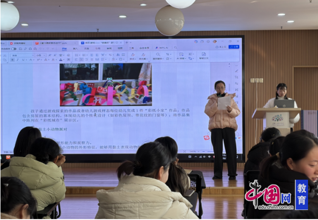 活动中,江阳区张坝幼儿园各班级老师依次进行创设区域方案预设专项汇报。如张老师分享的“布·纸”走廊活动方案分享,汇报结合案例、图片、视频等形式生动直观,现场互动交流氛围热烈。随后,其他教师按沙池、树屋、滴滴城等12个区域分组,开展30分钟游戏玩法共创。各组聚焦现有玩法优化与新玩法创新,群策群力梳理出不少于10个游戏项目,以专项汇报展示的形式交流成果,后续补充讨论让优质思路充分碰撞。