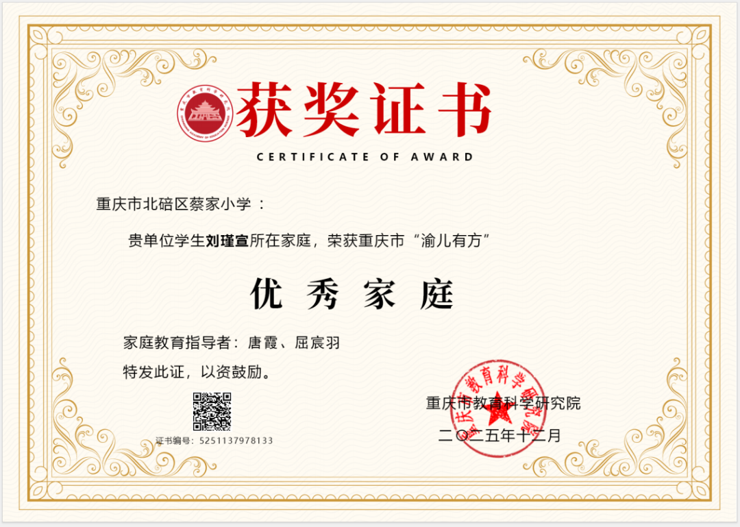 近日,重庆市蔡家小学 学生刘瑾宣所在家庭获重庆市“渝儿有方”优秀家庭。这一荣誉是对该家庭践行科学家教、传承优良家风的高度认可,更是家校社协同育人的生动见证!