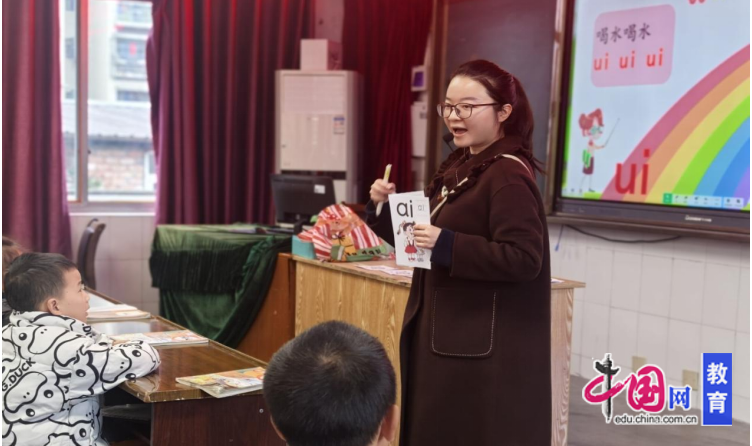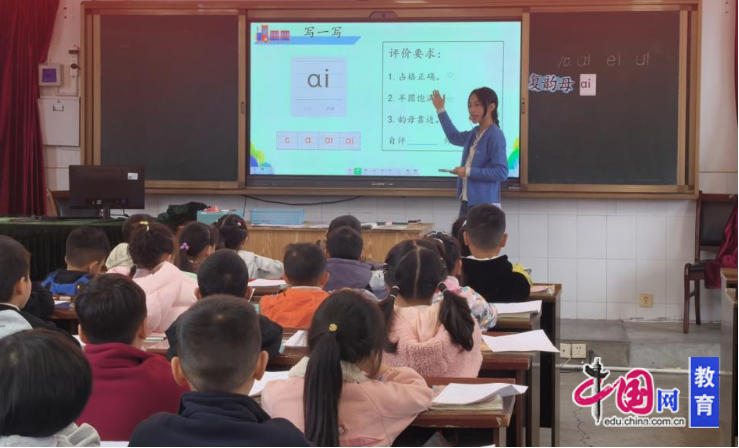 旷春燕老师执教的是统编版一年级上册《ai ei ui》,开篇旷老师通过单韵母复习巩固旧知,自然衔接新知,引出首个复韵母“ai”的学习。之后以学生为主体,通过情境感知、游戏互动、分层练习,掌握ai的“发音—字形—书写—标调—拼读”,最后结合会认字“白菜”,进行音节拼读与识字联动,在具体语境中巩固“ai”的运用,并通过书写展示、互评互改,落实学习评价。让学生在轻松愉悦的氛围中扎实掌握复韵母“ai”的相关知识与技能。