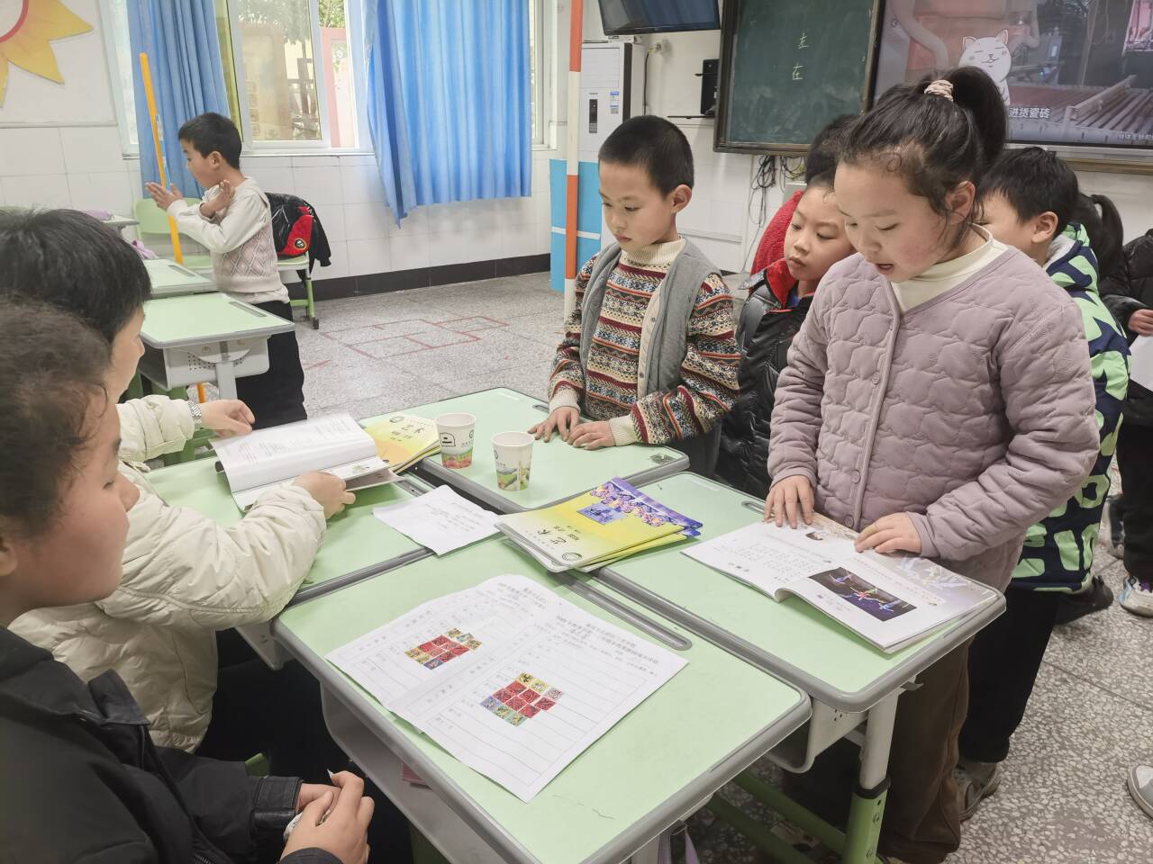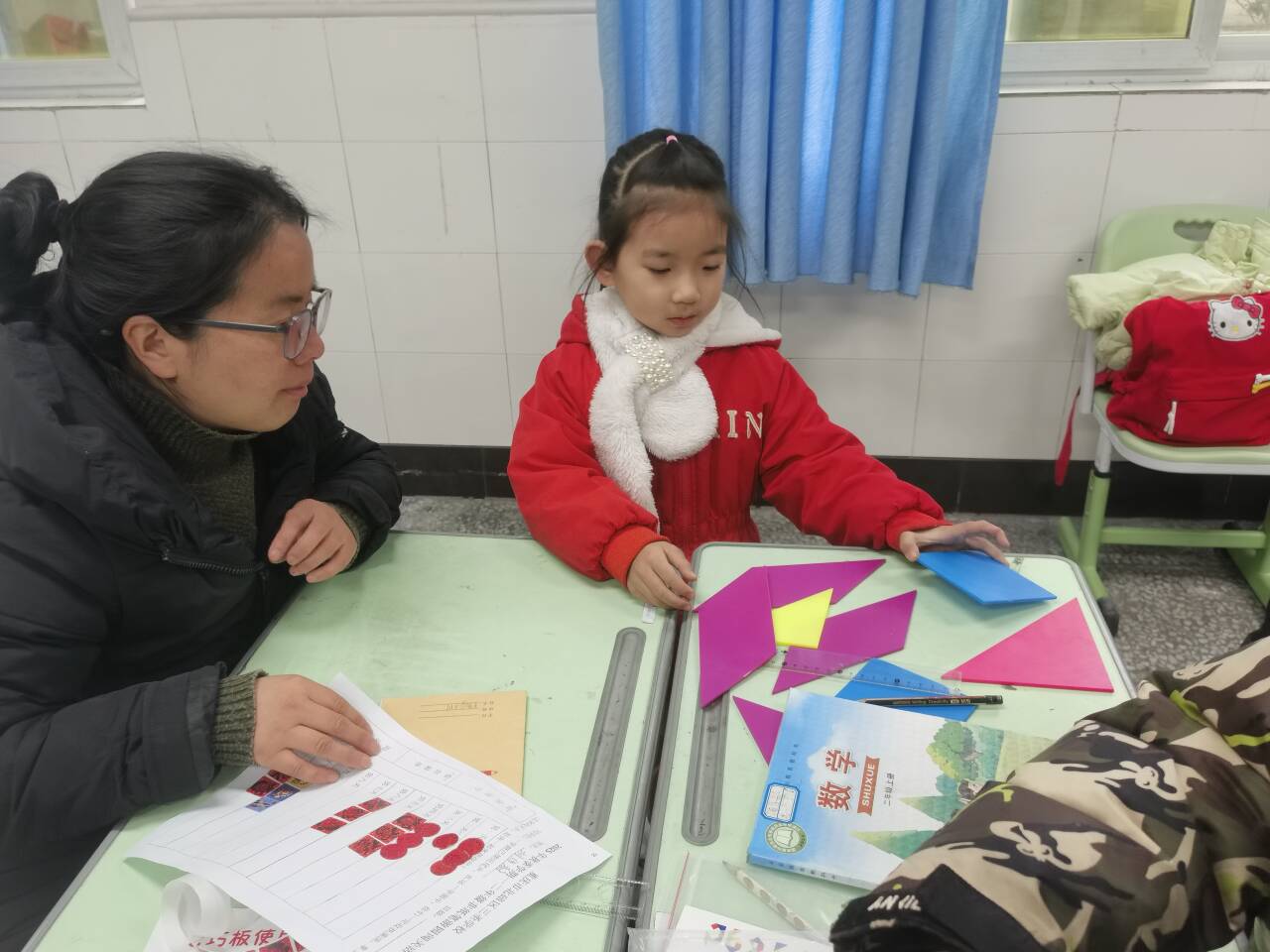 一年级的同学巧用七巧板,现场拼出长方形、正方形、三角形和平行四边形,在动手实践中感知图形之美。二年级的同学们则拿起直尺,准确测量长度,并通过抽签判断生活中常见物体的高度该用“厘米”还是“米”作单位,将数学知识活学活用。
