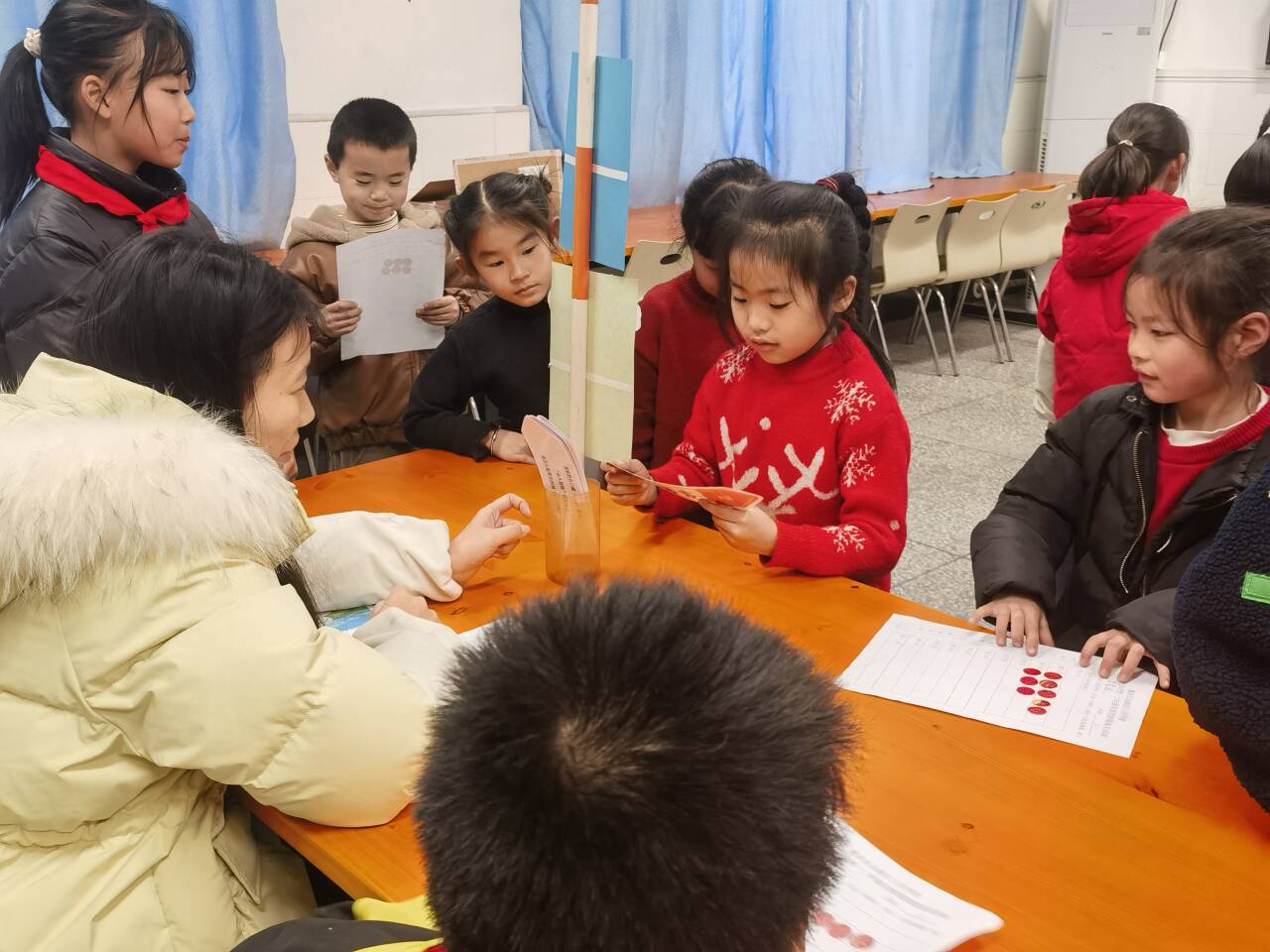 孩子们随机抽取写有歌名的纸条,然后迅速在音乐书中找到对应的曲目并自信演唱。稚嫩而嘹亮的歌声回荡在活动现场,每一张笑脸都写满了快乐与自信。