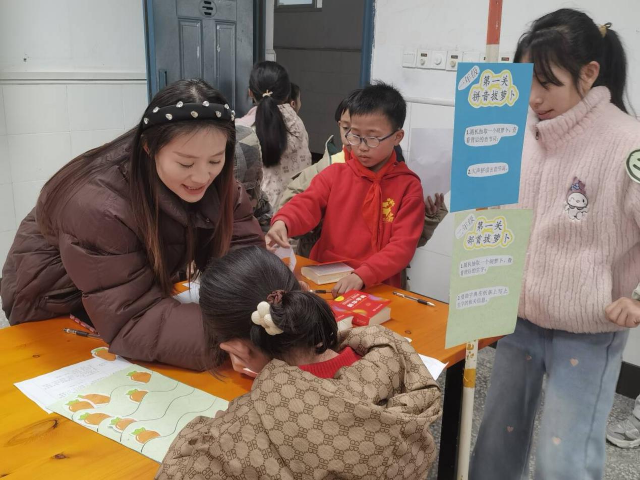 孩子们从“萝卜地”里抽取一张卡片。一年级的萌娃们需要大声拼读出卡片背后的音节词;二年级的小朋友们则要借助字典,快速查出指定生字的部首、笔画、读音,并为其组词。知识的小种子,在这一拔一“查”间悄然生长。