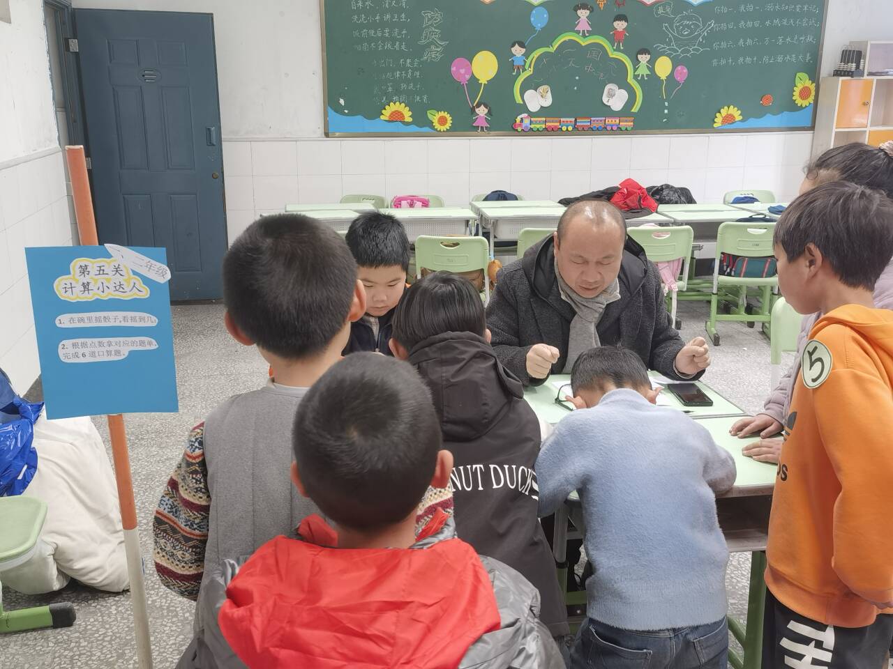 孩子们转动转盘抽取数学题,一年级的“讲题小能人”们把解题思路讲得头头是道;二年级的“操作小能手”们需先读出转盘上的数字,再说出它的组成,最后用计数器拨出这个数字,将抽象的数感变得触手可及。
