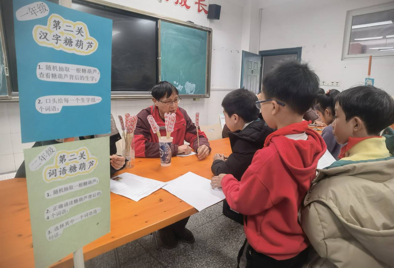 孩子们随机抽取一根“糖葫芦”。一年级的小朋友要流利地认读出上面的四个生字,并能为每个字组词;二年级的同学则需挑战认读两个二字词语、一个三字词语和一个四字词语,并从中挑选一个造句。词语像糖葫芦一样串联起来,编织出语言的甜美滋味。