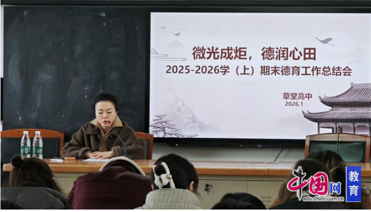 为全面复盘学期德育工作成效,精准锚定新学期育人方向,1月23日,乐山市草堂高中政教科组织全体班主任齐聚学校会议室,召开2025秋季学期期末德育工作总结会。会议由政教科副主任殷窈婷主持,副校长彭媛媛参加会议并作总结讲话。