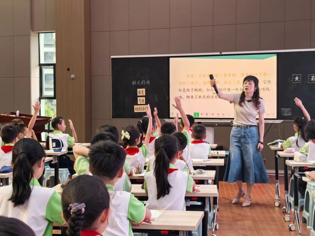 江智莲老师执教的《秋天的雨》聚焦重点段落展开品读,引导学生体会文字的修辞魅力与画面美感,通过句式仿写的实践,让学生在表达中感受秋日的美好。汤静老师带来趣味语文课《竹节人》,引导孩子有目的地阅读,感受传统玩具带来的乐趣。张谷宇老师执教的《太阳》一课,巧妙融合文本分析与科学探索,让说明方法不再抽象。