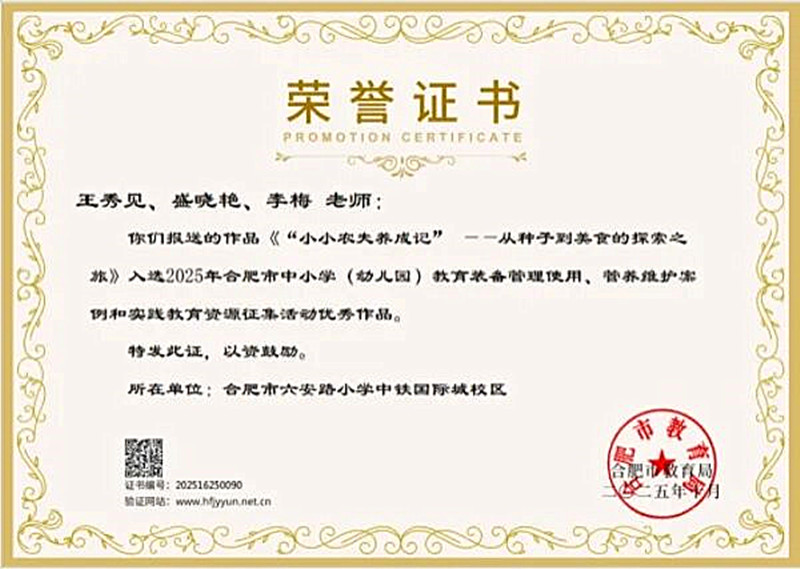 此外,在安徽省中小学(幼儿园)教育装备管理使用、管养维护案例和实践教育资源征集评选活动中,由王秀见、盛晓艳、李梅三位老师共同提交的案例《Ai赋能·小小农夫养成记——从种子到美食的探索之旅》荣获市级及省级“优秀案例”称号,充分展现了六安路小学中铁国际城校区教师在跨学科融合与教育技术应用方面的积极探索与创新实践。