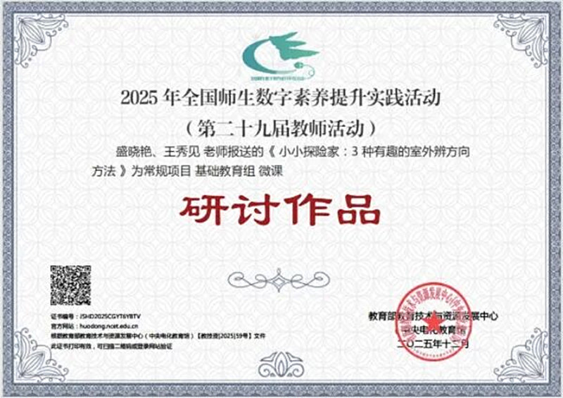 在第二十九届全国师生数字素养提升实践活动中,合肥市六安路小学中铁国际城校区数学组盛晓艳、王秀见老师共同设计的微课作品《小小探险家:3种有趣的室外辨方向方法》表现突出。该作品自区级选拔开始,历经层层评选,先后荣获市级一等奖、省级一等奖,最终成功入围全国展示,并被教育部教育技术与资源发展中心遴选为常规项目基础教育组微课研讨作品。