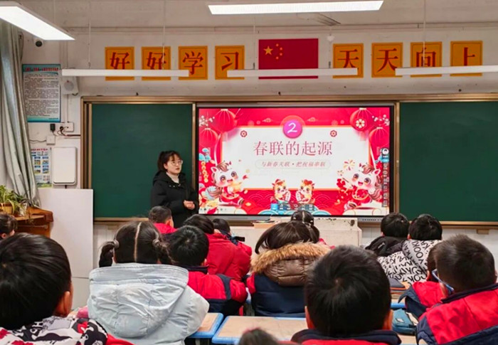 在活动前期,为了让学生更好地感受春联文化的魅力,各班级组织召开了“探春联奥秘 传千年文脉”主题班会。通过图文并茂的讲解,师生们共同追溯了春联的起源与发展,了解其由“桃符”演变至今的历史脉络,理解春联在文化传承中所承载的迎祥纳福、辞旧迎新的美好寓意。