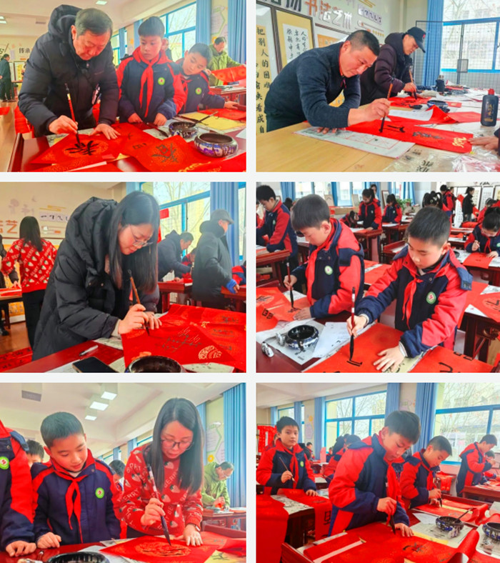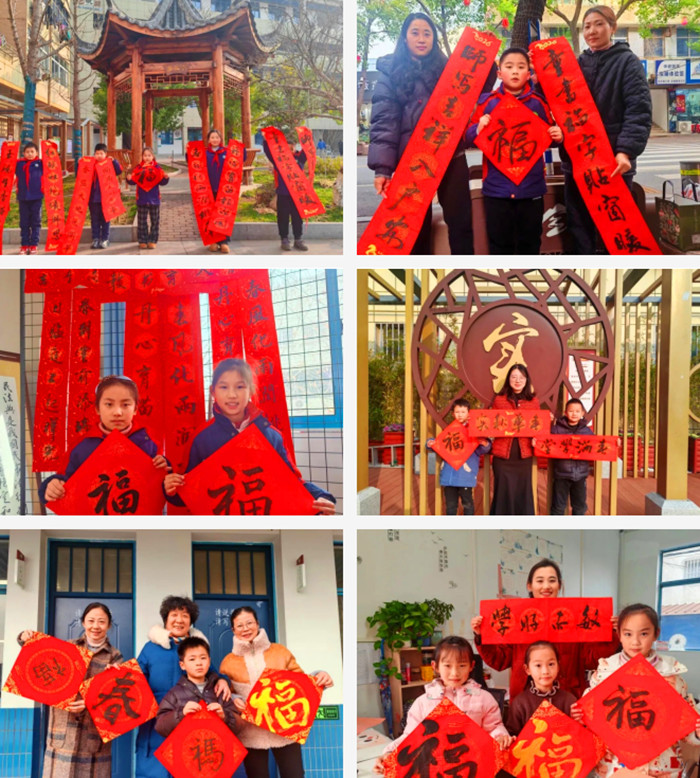 低年级学生以书写“福”字为主,中高年级学生则尝试书写完整的春联。大红宣纸铺了一桌又一桌,各种字体的“福”字,一幅幅的春联,或工整,或灵动,都藏着孩子们最真诚的新年祝愿。