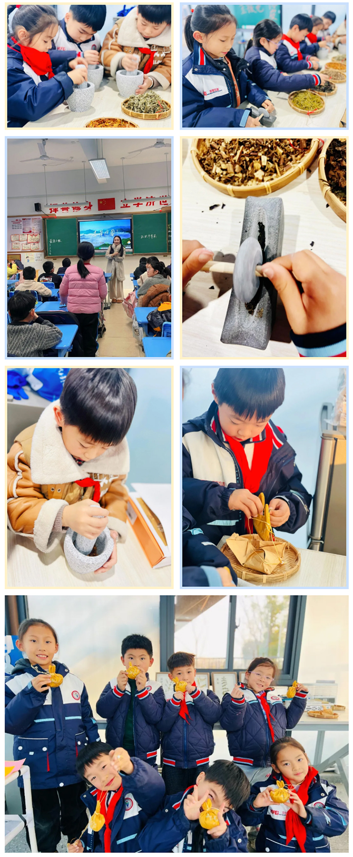 孩子们还根据《天工开物》中记载的传统中草药加工技艺,了解古法炮制工艺的基本原理与操作要点。在晾晒、去杂、研磨的动手实践中感受传统劳动的智慧。通过将研磨好的药粉精心制作成香气四溢的中草药香包,并且通过不同配方,调配成提神专注、抵御感冒、防范晕车等不同香型和功能。一个个凝聚着劳动汗水与创意的香包,既承载着孩子们对传统文化的理解,也成为孩子们在知行园耕耘四季,收获成长的美好回忆。