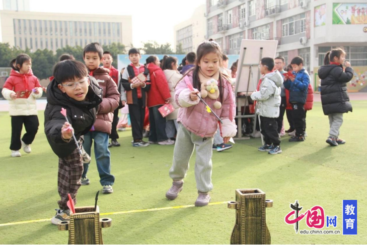 古礼投壶,化身为“春节愿望我来投”的体育趣关。孩子们凝神静气,瞄准、投掷,不仅锻炼了手眼协调与身体控制能力,更在“一发未中,再三尝试”的过程中,切身实践了专注、从容与坚持不懈的体育精神。传统礼仪与现代教育目标在此完美契合。在“春节习俗我来扬”的温馨对话中,师生共同探讨贴春联、吃团圆饭、拜年等习俗背后的文化内涵。孩子们在讲述与倾听中,增进对孝亲敬老、家庭和睦、辞旧迎新等中华传统美德的理解与认同,文化自信的种子悄然埋下。
