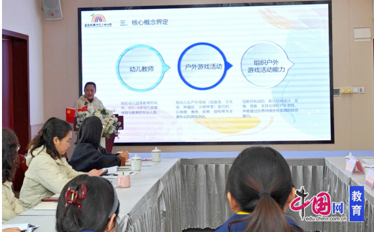 会上,课题主研教师裴媛媛以“聚焦能力提升,让户外游戏更具教育价值”为主线,系统汇报了课题研究背景、目标及“启程·预设准备—行进·察引为伴—归程·思评共长”的三阶九段培养模式。主研成员刘毅则从组织架构、实施步骤、实践成果等方面作工作报告,展示了园本课程资源、教师成长案例集等研究产出。