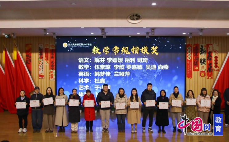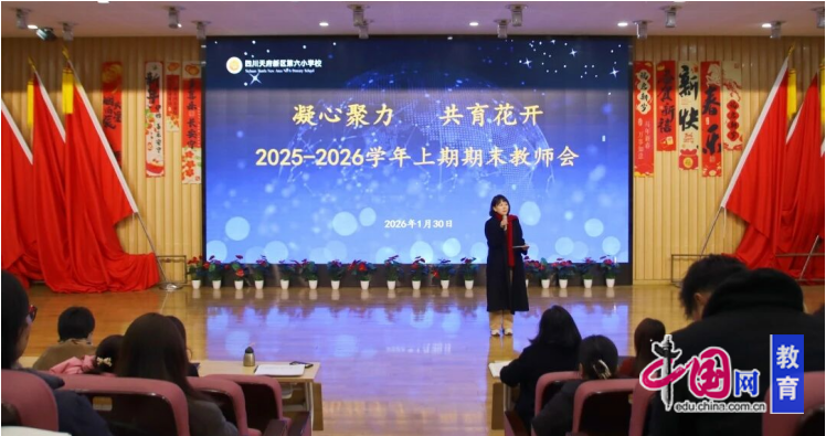 近日,四川天府新区第六小学校全体教职工齐聚一堂,举行了以“凝心聚力,共育花开”为主题的2025-2026学年上期期末教师总结大会。本次会议以“童心童行 同行同心”为理念,在回顾与展望中凝聚教育初心,在欢笑与感动中传递团队温度。