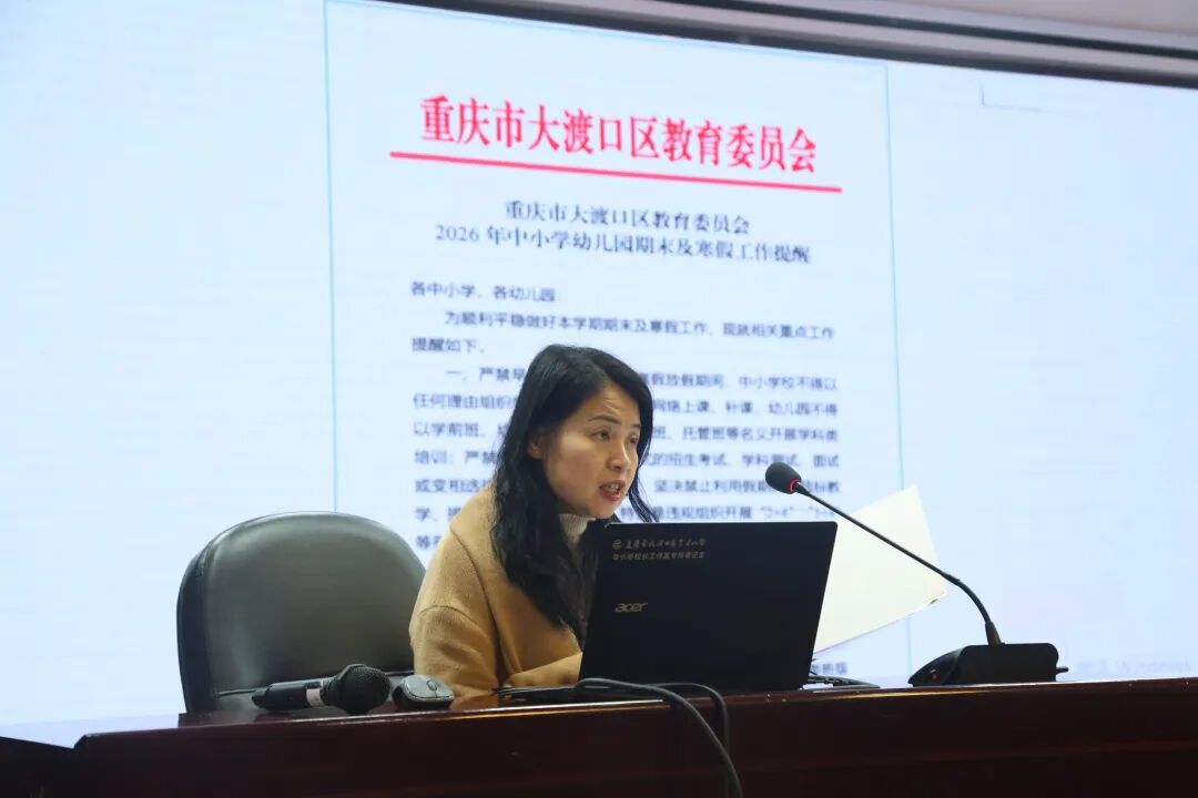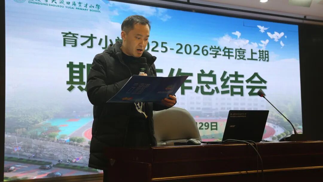 1月29日,重庆市大渡口区育才小学2025-2026学年上期期末工作总结会在建设村校区召开,全体教师参会。会议由学校党委专职副书记杜官举主持。