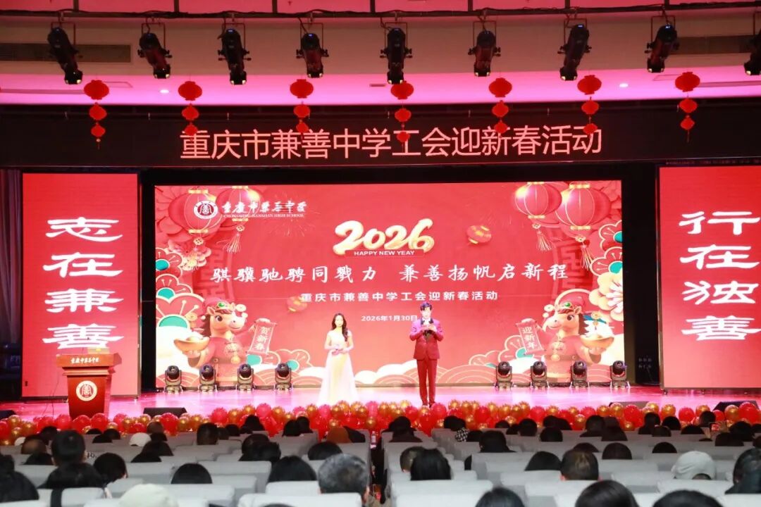 1月30日晚,重庆市兼善中学南区、北区、龙凤校区全体教职工齐聚南区明德报告厅,辞旧岁、迎新春,忆耕耘、启新程。现场华灯璀璨,光影交织,洋溢着喜庆祥和而又团结奋进的浓厚氛围。