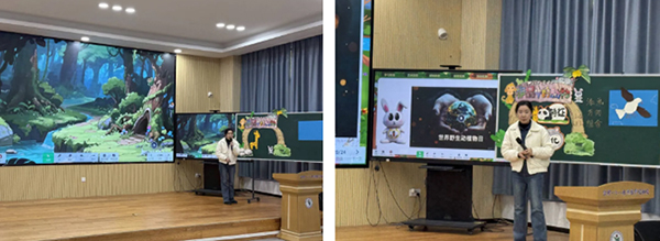活动上半场聚焦专业能力提升,薛阳老师带来《作品中的动物》说课分享,将美术创作与生态保护教育深度融合,通过“一张纸的魔法”等趣味设计,让美育与环保理念自然扎根学生心中。