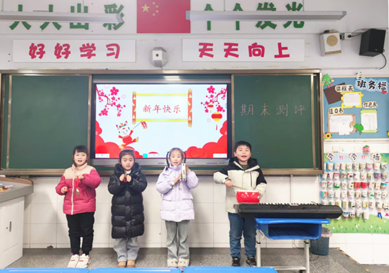 音乐学科紧扣新课标核心素养,设计三大趣味考核环节。学生通过大转盘抽歌完成表演唱,借助打击乐器为《小拜年》《过新年》等传统乐曲伴奏,搭配表情动作演绎,在艺术实践中提升审美感知、节奏把控能力,加深对传统节日音乐文化的理解。