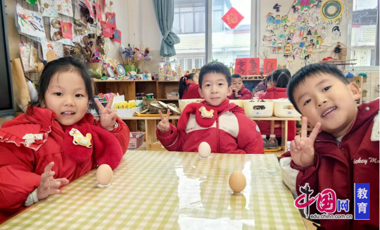 幼儿园注重以体验式教育连接传统文化。孩子们体验“打春”,轻拍树干模拟古时鞭打春牛,寓意唤醒沉睡的大地;亲手“剪春字”,将红纸剪出的希望贴于窗上;品尝“咬春”的清脆萝卜与春饼,把鲜活的生机“吃”进肚子里;尝试“立春竖蛋”,在专注中完成与地球引力的温柔对话。这些仪式不仅有趣,更在孩子心中埋下敬天爱时、顺应自然的种子。