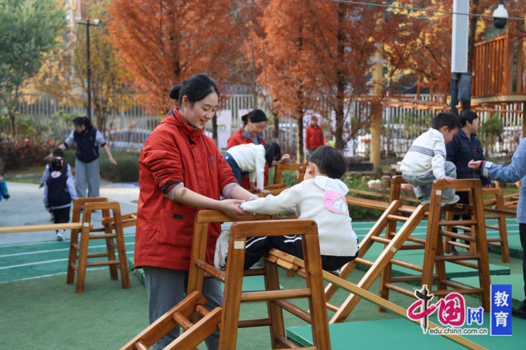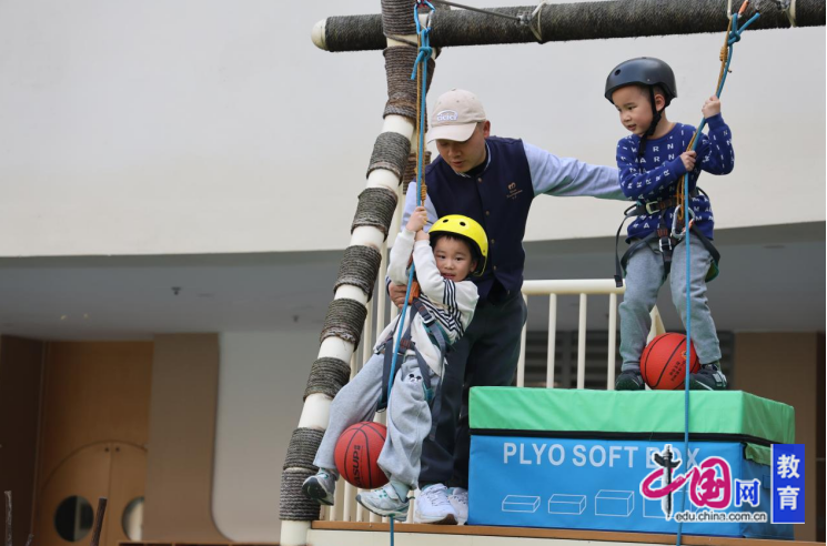 专业细致的成长支持贯穿始终。面对孩子的畏难情绪,教师并非简单鼓励,而是提供专业拆解与步骤化引导。例如,通过临时调整器械高度、规范助跑动作,帮助孩子积累“微成功”体验,从而跨越心理障碍,实现能力与信心的螺旋式上升。针对不同年龄段的发展特点,幼儿园设计了递进式的活动:1-2岁幼儿以感统训练为主,通过触摸树皮、拾捡花瓣等激活感官;3-4岁中班儿童开展平衡木、简易攀爬等协调性训练;5-6岁大班孩子则挑战跳绳、攀岩等需要耐力和技巧的项目。