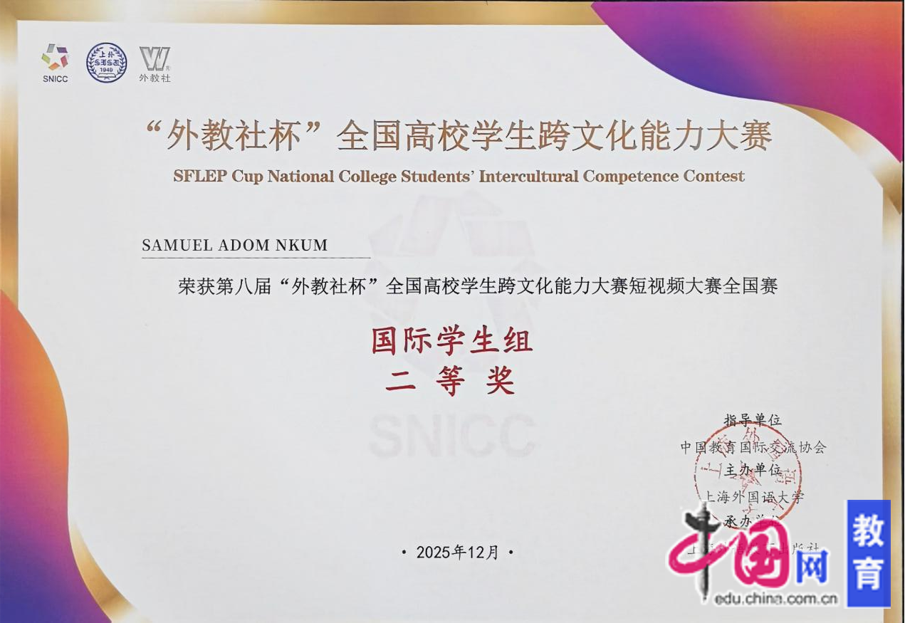 近日,第八届“外教社杯”全国高校学生跨文化能力大赛短视频大赛全国赛落下帷幕。江西水利电力大学来华留学生SAMUEL ADOM NKUM凭借作品《豫章故郡.赣鄱烟云》斩获国际学生组全国二等奖,实现学校来华留学生在国家级学科竞赛中的历史性突破。
