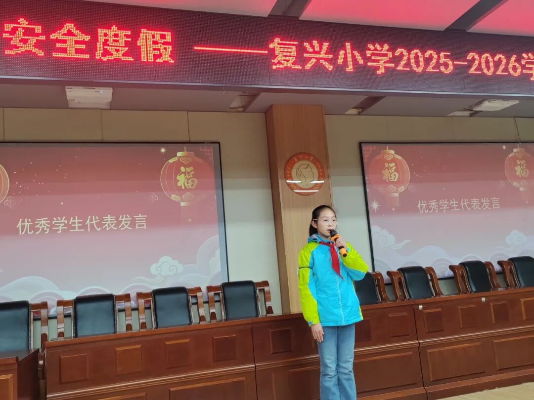 随后,四(4)班的韩依诺同学作为优秀学生代表登台发言。她落落大方,结合切身感悟,畅谈学习收获,展望假期蓝图,充分展现了复兴学子笃学力行、志存高远的风采。