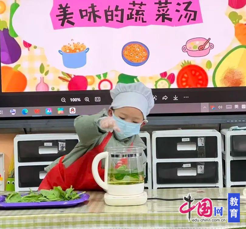 在“家庭区”角色游戏中,星星和诚诚化身小厨师,洗菜、切菜、炒菜,忙得不亦乐乎。媛媛抱着娃娃,泽泽学着爸爸的语气说:“吃饭啦!今天我做的是超级蔬菜大餐,很有营养哦!”从“抗拒蔬菜”到“推荐蔬菜”,孩子们在角色转换中完成了认知的内化。教师观察到,通过模仿成人、重复正向语言,孩子们逐渐建立起“蔬菜有营养、不挑食更健康”的积极观念。洗净小手、穿上围裙,孩子们变身“小主厨”。洗菜、入锅、搅拌……当清甜的蔬菜汤煮好,孩子们端起小碗,眼睛亮晶晶地说:“汤真好喝呀!”这是食物最原始的吸引力,也是劳动后最甜蜜的预告。