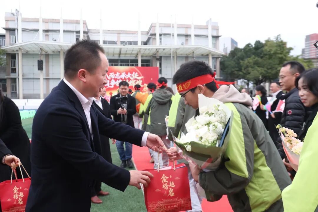 本次大会分为三个篇章,庄重热烈,催人奋进。青春当燃,少年当立。仪式伊始,高三全体学生身着校服,排成整齐的纵队,精神抖擞、意气风发,与家长携手共进“成人门”,班主任手持班牌带队。入场时,礼花绽放,校领导及教师们在门内侧微笑等候,为学生送上真挚的祝福和贴心的励志礼盒。