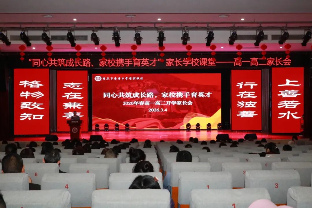 春阳暖煦,万物生长。2026年3月4日上午,重庆市兼善中学蔡家校区举行高一、高二年级家长学校课堂。本次大会以“同心共筑成长路,家校携手育英才”为主题,旨在搭建家校心灵桥梁,共促孩子健康学习。