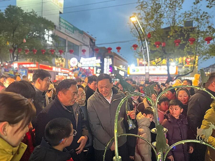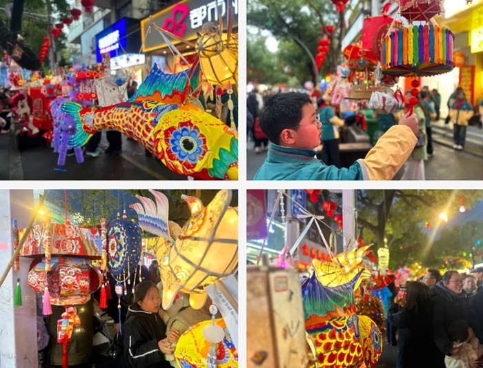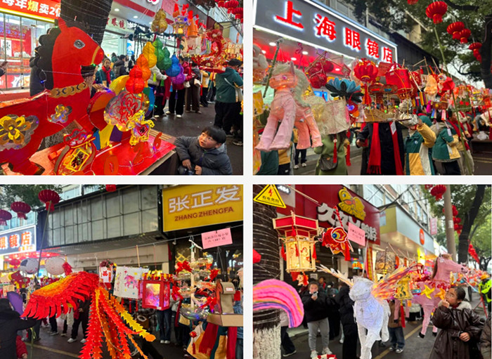 夜幕降临,华灯初上。全椒县新华路被数千盏学生自制的花灯点亮,这些花灯造型各异,既有传统的灯笼样式,也有融入现代创意的设计。花灯悬挂在道路两旁,宛如两条七彩长龙,将街道装点得绚丽多彩,吸引了数万市民前来观赏。