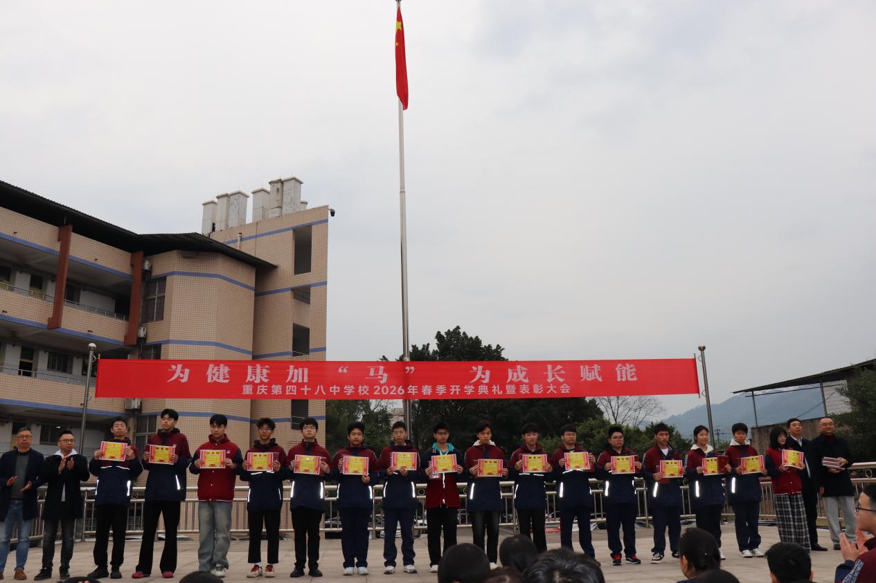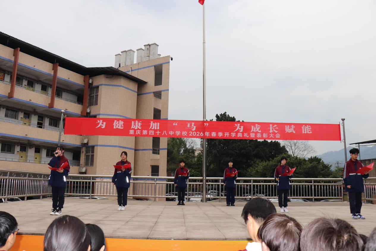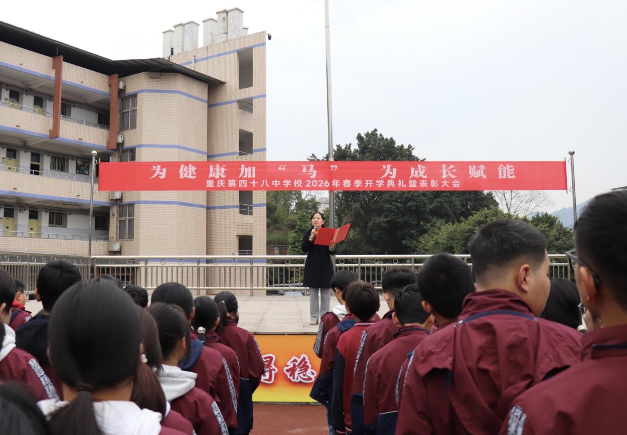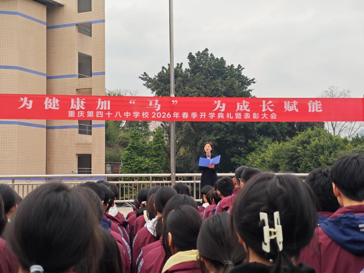 2026年3月5日上午,重庆第四十八中学校隆重举行2026年春季学期开学典礼。本次开学典礼由学校党总支书记晏祥兰主持,全体师生齐聚学校运动场,共同开启新学期的学习与成长新征程。本次典礼以“为健康加‘马’,为成长赋能”为主题,深入落实教育部健康学校建设相关要求,践行“健康第一”教育理念。