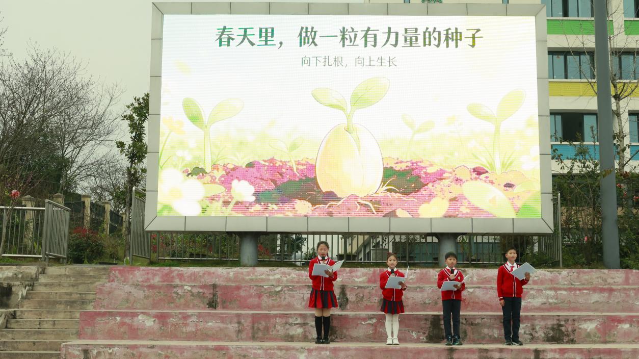 在主题展示环节,“金话筒主持人社团”带来朗诵《春天里,做一粒有力量的种子》,用真挚的语言诉说少年志向,传递成长力量。