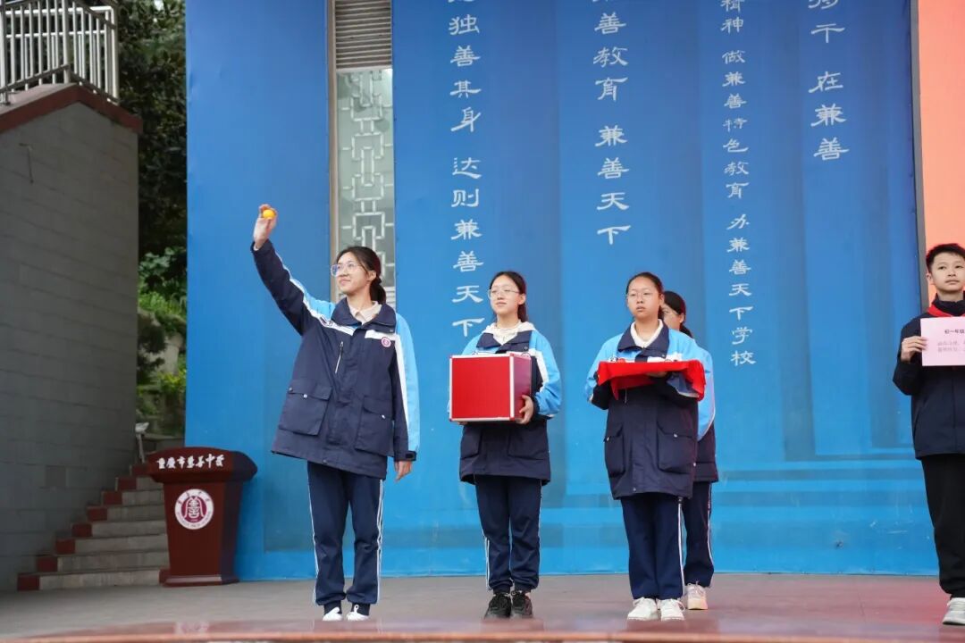 使命凝志,誓言铿锵;彩球载愿,领志前行。初一至高二各年级学生代表登台,从红色彩球箱中抽取对应新学期使命的彩球,并高声宣读各年级专属使命,台下学子齐声呼应,铿锵誓言镌刻少年壮志。随后,校领导为各年级授予骐骥凌云战旗,五面战旗迎风舒展,各年级依次喊出专属口号,最后全校师生齐喊“秉善笃行 骐骥凌云”,凝聚起同心笃行的磅礴力量,将典礼氛围推向顶峰。战旗在手,使命在肩,兼善少年以凌云之志,立下了跃马新程的铮铮誓言。
