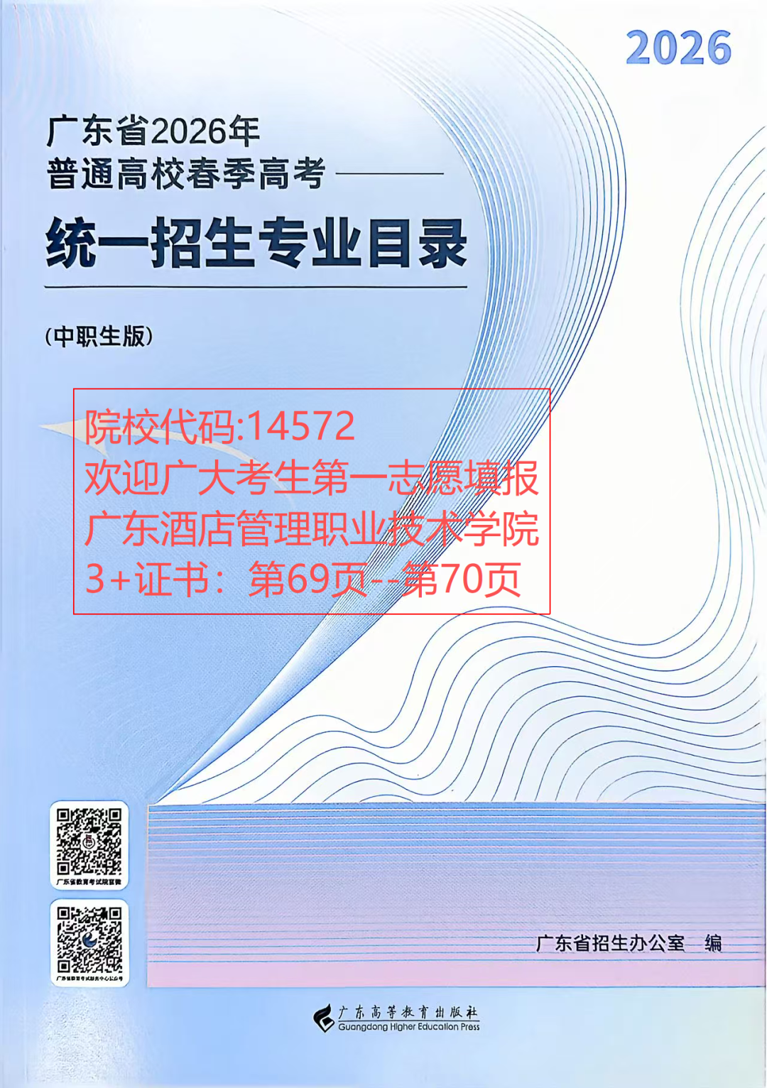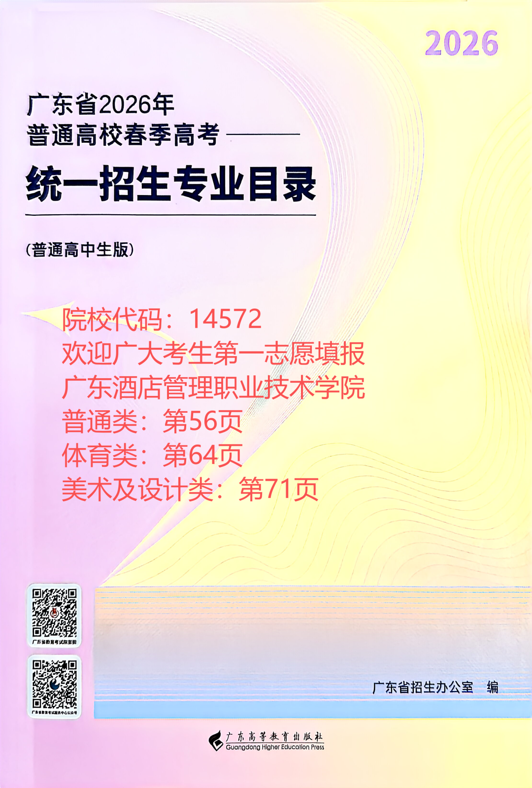 为方便广大考生查询及填报,相关招生信息已收录进《广东省2026年普通高等学校招生专业目录》。考生可按需查阅:中职生版“3+证书”类(第69-70页),普通高中生版普通类(第56页)、体育类(第64页)及美术与设计类(第71页)。