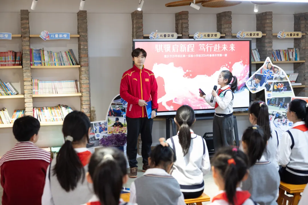 春启新程,策马奋进。3月5日上午,重庆市沙坪坝区第一实验小学校以“骐骥启新程·笃行赴未来”为主题,在学校操场隆重举行2026年春季开学典礼,全体师生齐聚一堂,特邀特警总队、全国花样滑冰男单冠军李鸾锋共同参与,在昂扬的氛围中开启新学期的逐梦之旅。