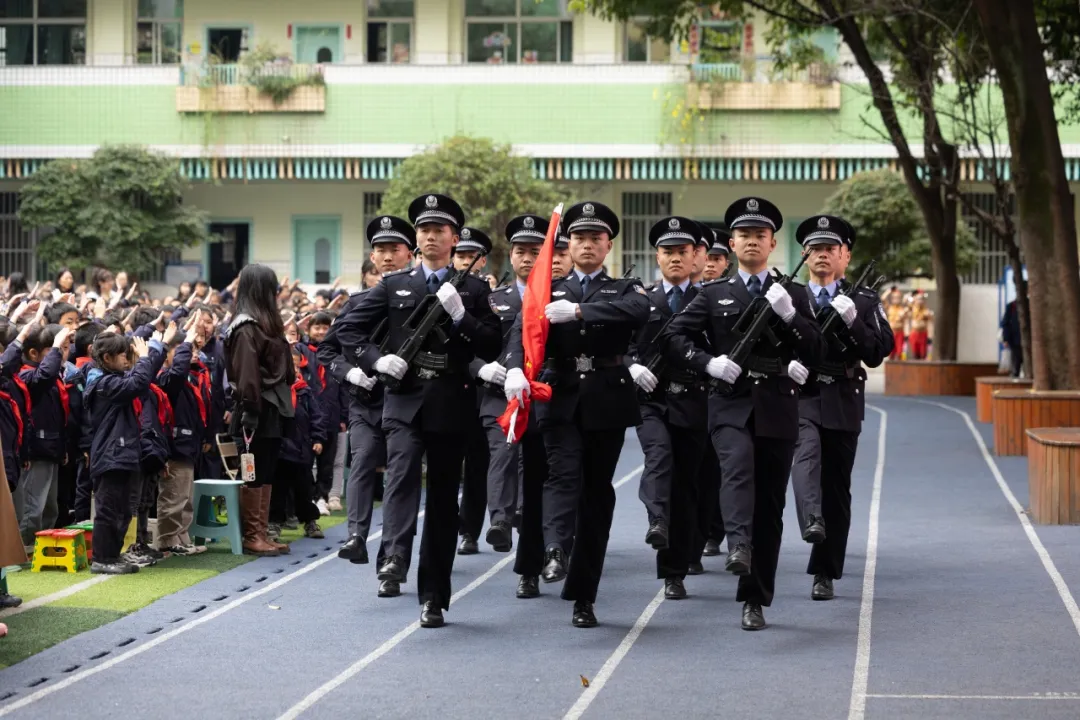 特警总队仪仗队以庄严肃穆的升旗仪式与整齐铿锵的方阵步伐,生动诠释了人民警察的风采,在全体师生心中厚植爱国主义情怀,激励众人立报国之志、扬中华国威。