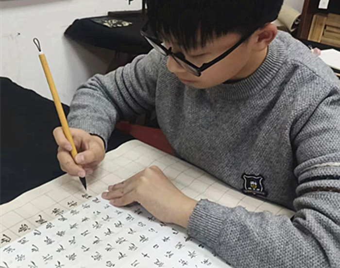 为了准备提交此次书法展的投稿作品,徐君翔同学花费了两周的课余时间进行练习。在练习期间,他曾遇到了许多困难,经常出现字形不准、笔画出错、用笔不正确等问题,甚至因为某个笔画的不完美,对完成作品失去信心。最终在家人和老师的鼓励下,静下心来反复练习,不断调整,完成了令人满意的作品。