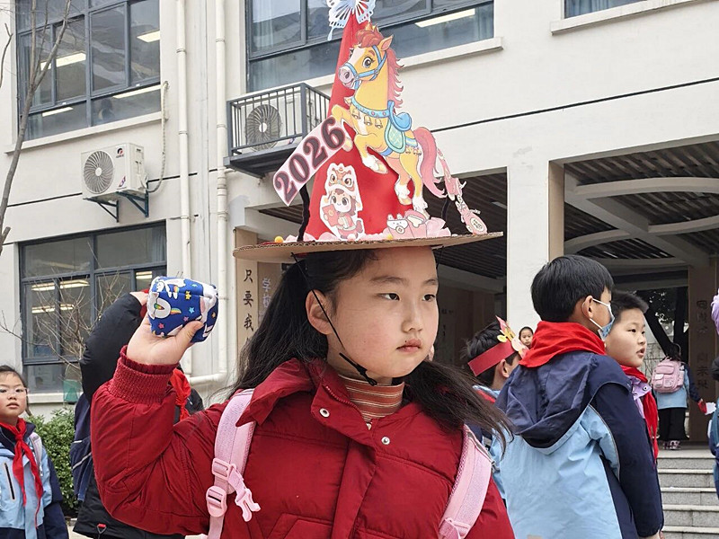 清晨8:00,校园门口已是欢声笑语。少先队员们戴着饱含自己奇思妙想和新学期期许的创意“马头帽”早早踏入校园,将马年吉祥寓意与趣味游戏融为一体。幸福大道上,精心布置的马年主题展板格外醒目,板上设置了多个寓意美好的镂空投靶区域,每一处都藏着专属新学期的美好彩头:马上有福、马上如意、马上成功、马上平安、马上吉祥、马上有才,一句句吉祥话承载着对队员们满满的期许。队员们手持沙包,屏息凝神、瞄准投掷,每一次投中都引来阵阵欢呼。大家在欢声笑语中讨彩头、纳福气,现场暖意融融、热闹非凡,洋溢着喜庆与欢乐。