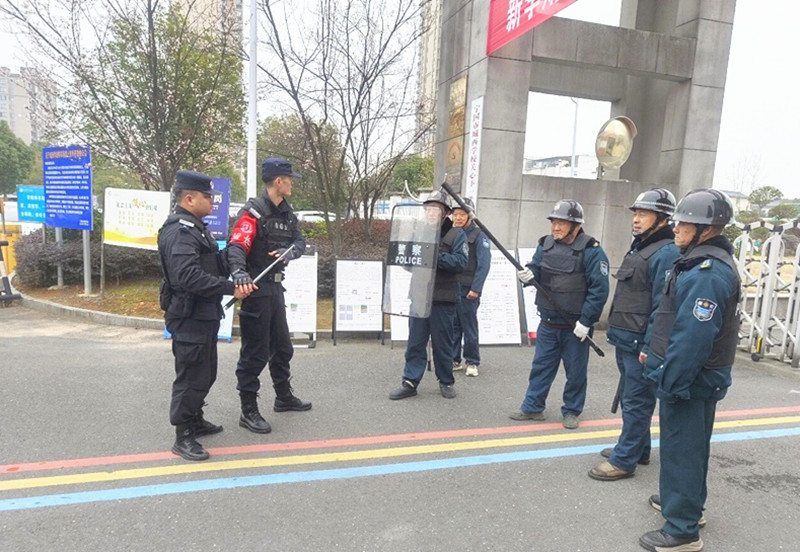 在随后的模拟反恐演练环节,现场模拟了“暴徒”试图强行闯入校园的突发场景。面对“险情”,保安师傅们迅速反应,在特巡警民警的指挥下,手持防暴盾牌、钢叉等器械,按照培训所学,快速形成有效防控阵型,成功将 “暴徒” 控制、带离,整个演练过程紧张有序、处置规范。