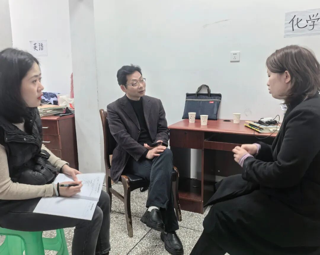 听课结束后,双方开展座谈交流,就教学工作深入探讨、凝聚共识。赵安强教研员围绕本次调研目的,重点解读了中高考命题的最新变化,强调教学要注重情境化设计,聚焦学生解决实际问题的能力培养,推动课堂教学向学科能力素养培育转型;同时提出,要积极推动AI赋能教学实践,助力实现“减负提质”,引导教师转变教学观念,将教育强国、爱国情怀、为党育人等思政元素有机融入课堂教学,落实立德树人根本任务。钱敬宗教研员则详细询问了我校学生到校情况、师生身心健康状况,了解学校如何保障教学工作高效有序开展。