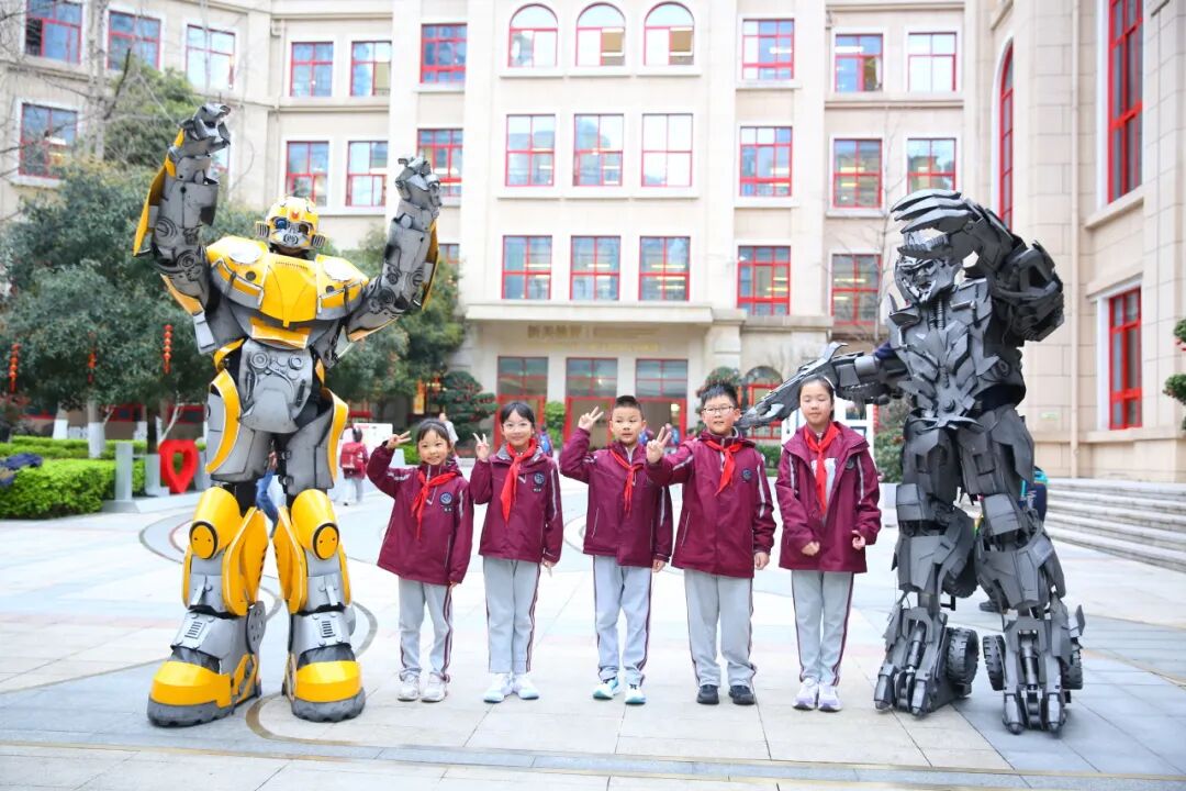 校门口,两台机器人昂首挺立,身形高大挺拔、威风凛凛,热情地朝来往的孩子们挥手问好,引来阵阵欢呼。
