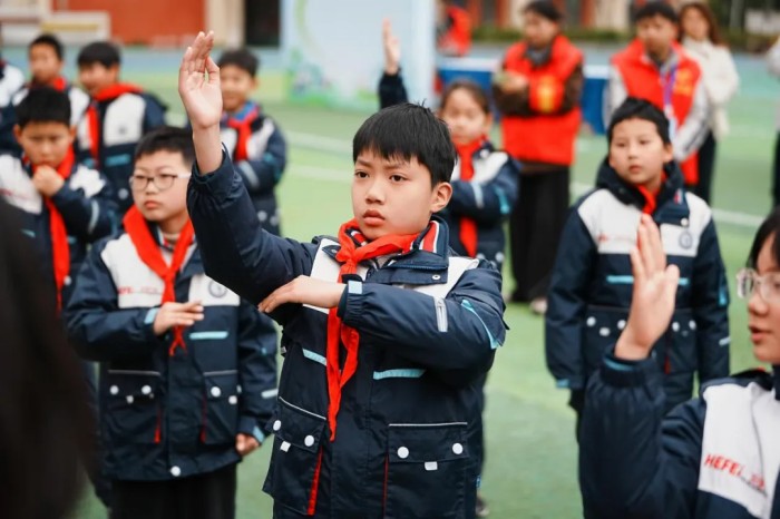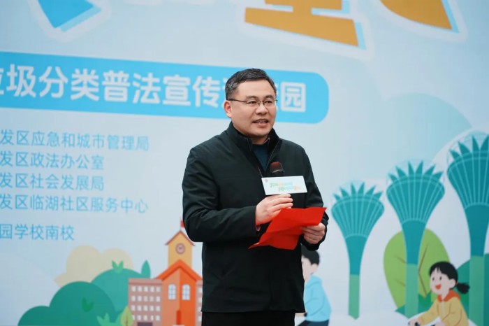 最动人的时刻,是垃圾分类倡议宣读环节。合肥经开区应急和城市管理局执法人员汪天翔与四名学生代表并肩而立,发出铿锵誓言:“从今天做起,从点滴做起,让垃圾分类成为习惯,让绿色低碳成为风尚!以少年之名,守护绿水青山;以赤子之心,共建美丽家园!”